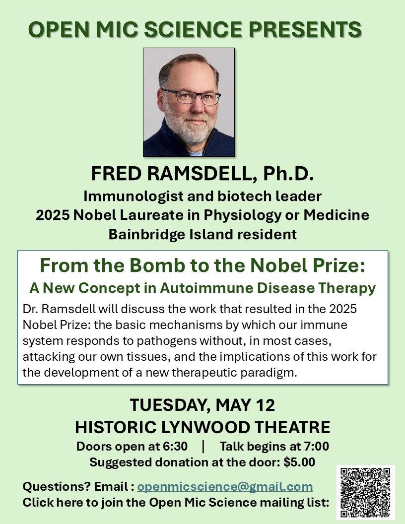 Open Mic Science Presents From the Bomb to the Nobel Prize When May 12, 2026 6:30 pm - 8:30 pm Add To Calendar Download ICS Google Calendar iCalendar Office 365 Outlook Live Where Lynnwood Theater 4569 Lynwood Center Road NE, Bainbridge Island, WA, 98110 This event is posted for community information and is not an IFC Event