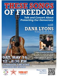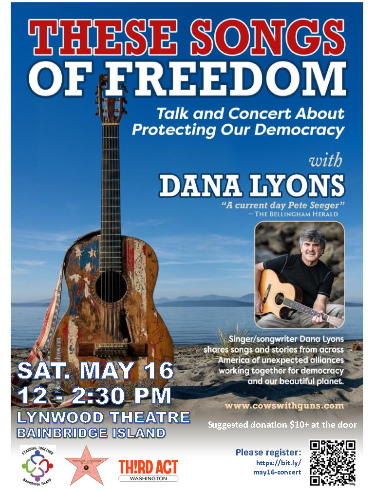 These Songs of Freedom When May 16, 2026 12:00 pm - 2:30 pm Add To Calendar Download ICS Google Calendar iCalendar Office 365 Outlook Live Where Lynwood Theater 4569 Lynwood Center Rd NE, Bainbridge Island, WA, 98110 Talk and Concert about protecting our Democracy with Dana Lyons.* Suggested Donation, $10 at the Door; Lynwood Theater this is posted for community information and is not an IFC Event